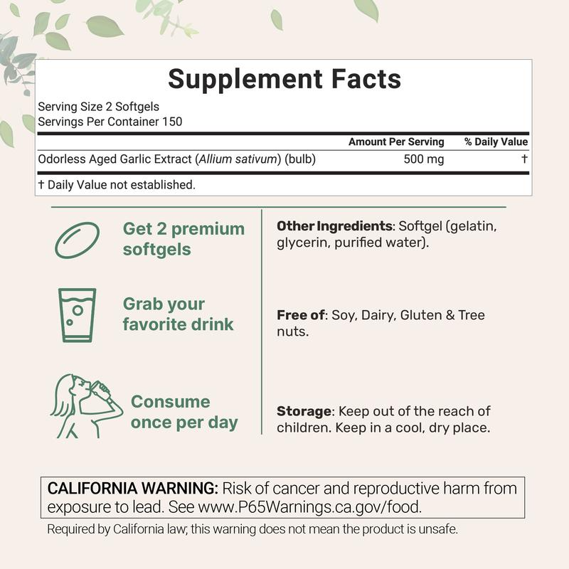 Take the recommended number of softgels daily with water, preferably with a meal. The garlic is carefully aged to create a stable, odorless extract that’s easy to absorb and gentle on your routine. With consistent daily use, it becomes a simple, no-prep way to incorporate aged garlic into your long-term wellness habits.